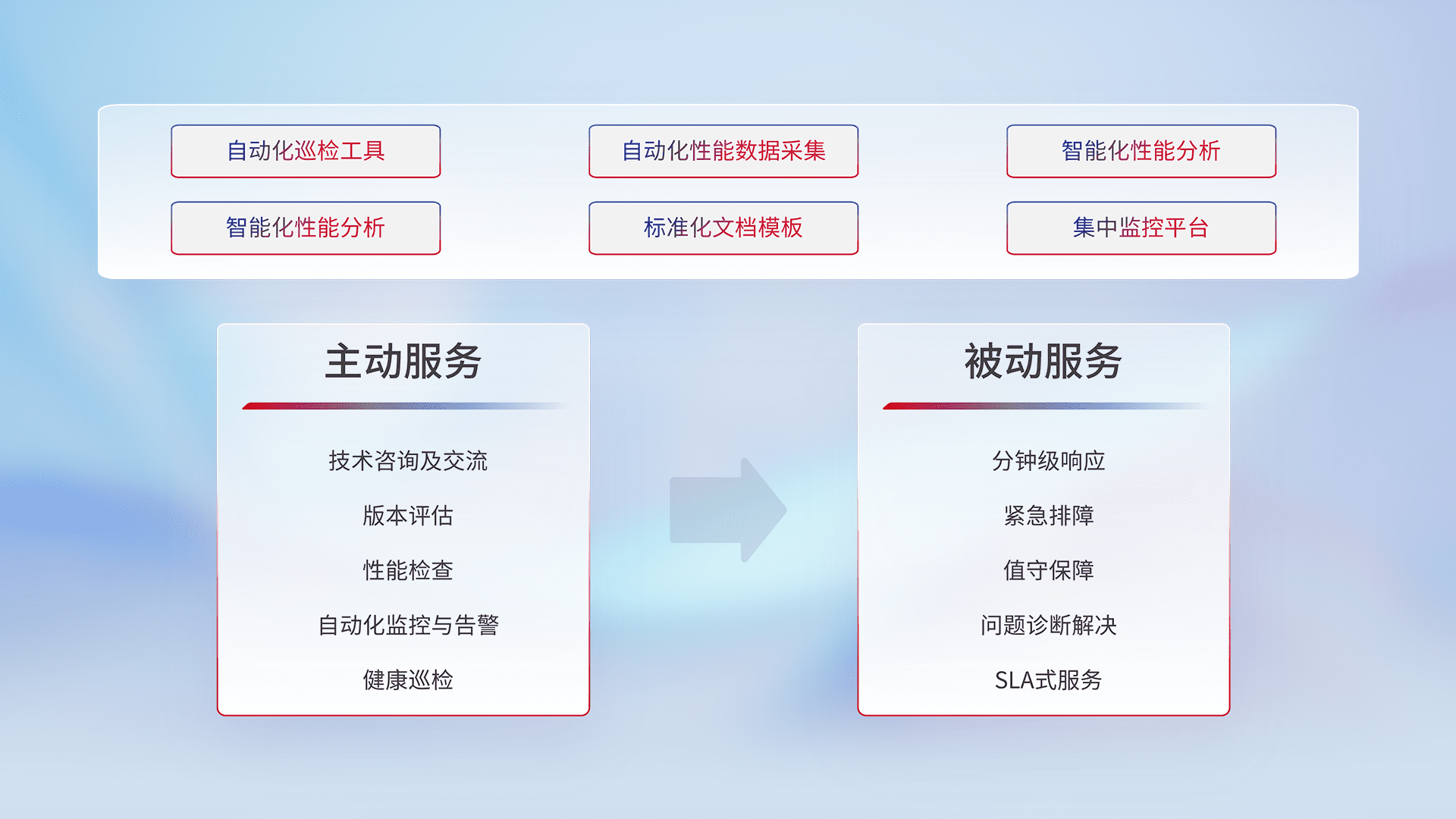 智能化工具和标准化文档,,,保障服务质量,,,,提供主动服务(包含技术咨询、、版本评估、、性能检查、、、、自动化监控与告警、、、健康巡检)和被动服务包含(分钟级响应、、、紧急排障、、、、值守保障、、、、问题诊断解决、、、SLA服务)。。